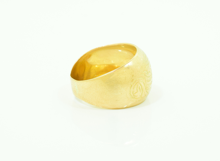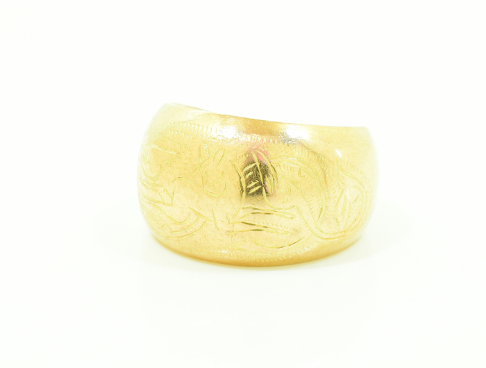 Masivní dámský prsten ze žlutého zlata s rytým vzorem po celém povrchu.