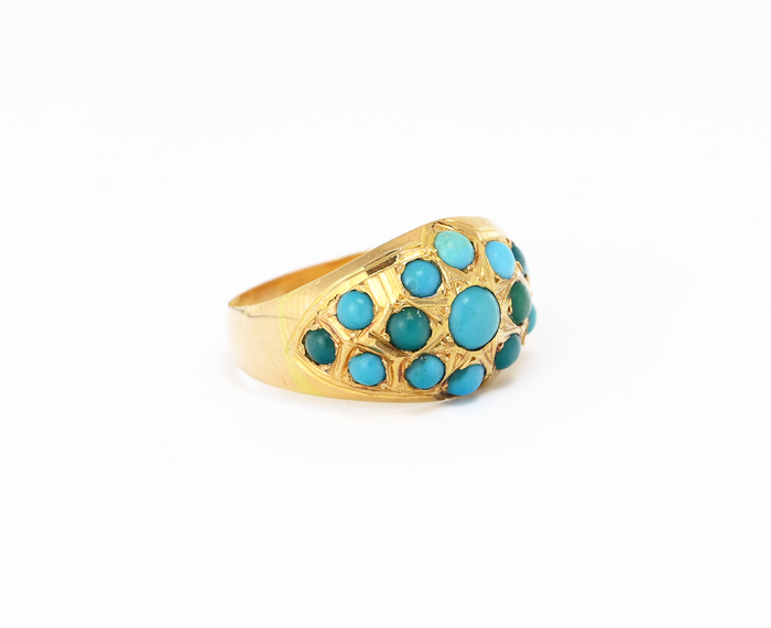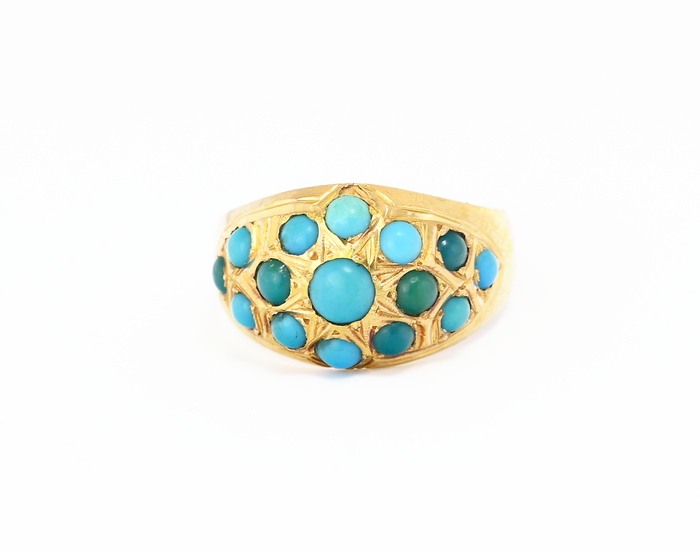 Zlatý prsten ve žlutém zlatě s modrými tyrkysy zasazenými do klenutého vrchlíku.