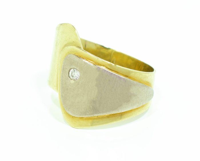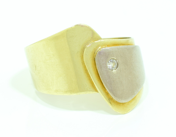 Dámský prsten ze žlutého zlata s překrývajícím se plátkem z bílého zlata a zirkonem.