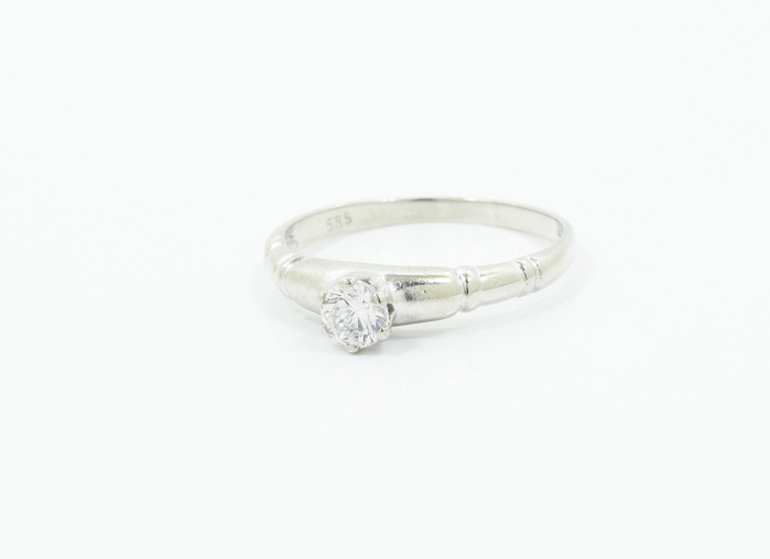 Dámský prsten z bílého zlata s kulatým průhledným zirkonem v korunce.