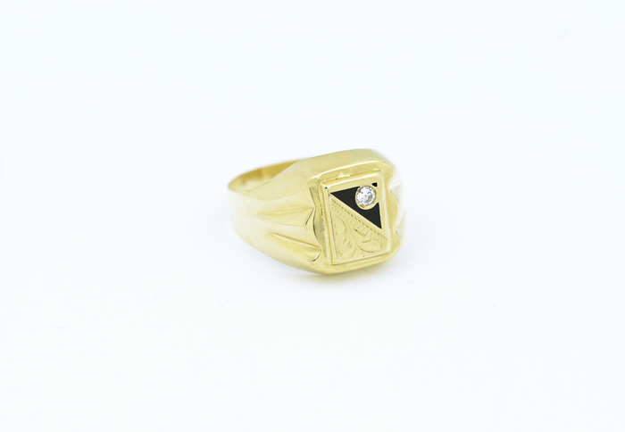 Pánský zlatý prsten s černým trojúhelníkovým prvkem a malým zirkonem.