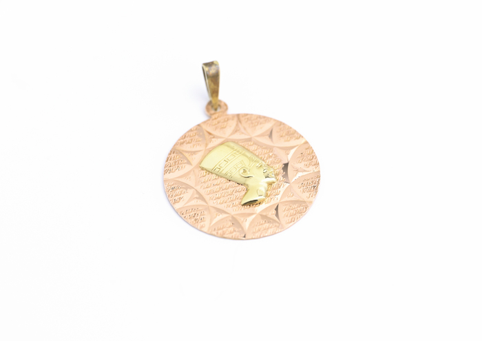 Kulatý přívěšek z červeného zlata s reliéfem egyptské královny Nefertiti ve žlutém zlatě.