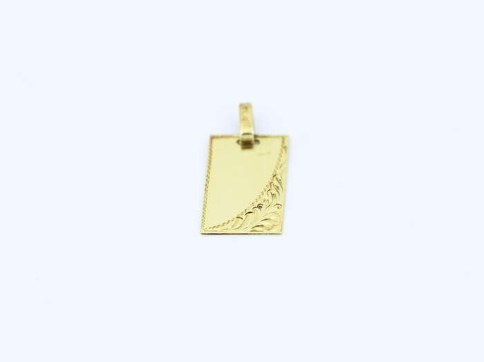 Zlatý přívěšek ve tvaru obdélníku se zdobeným rohem v žlutém zlatě.