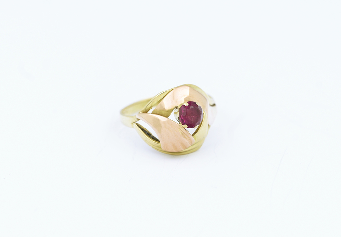Zlatý prsten, kombinované zlato, zdobený rubínem.