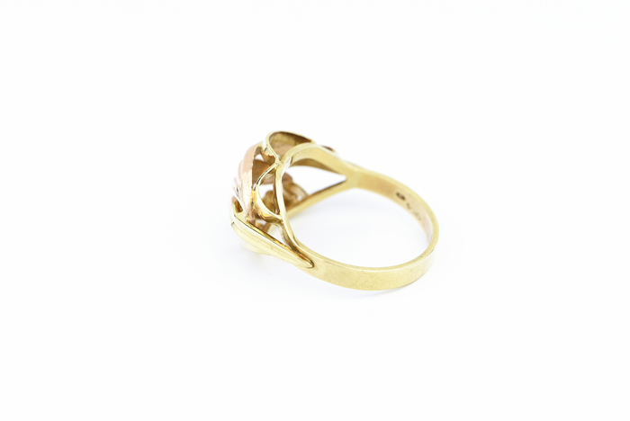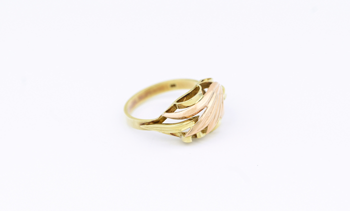 Zlatý prsten se vzorem listů ve žlutém a červeném zlatě.