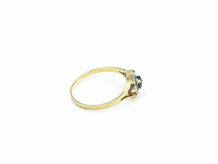 Zlatý prsten, korunka se zeleným kamenem, osázená zirkony.