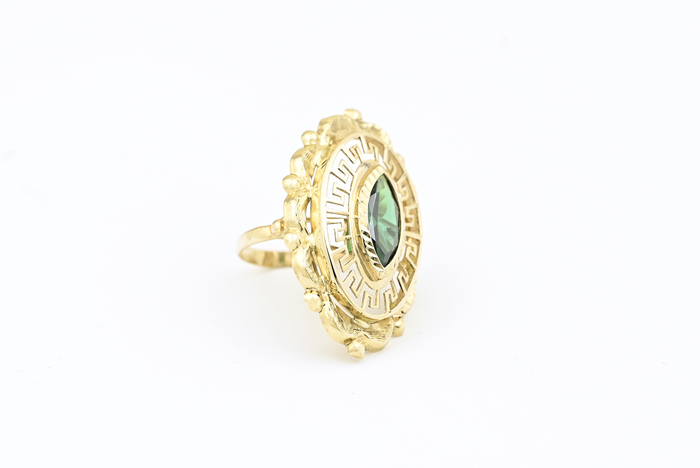Zlatý prsten, motiv versace zdobený zeleným kamenem.