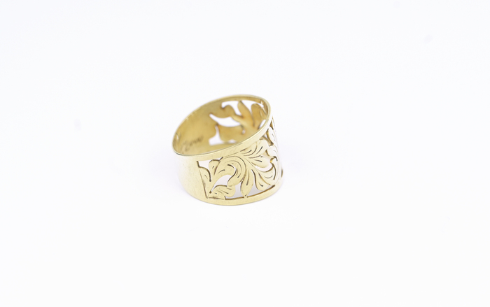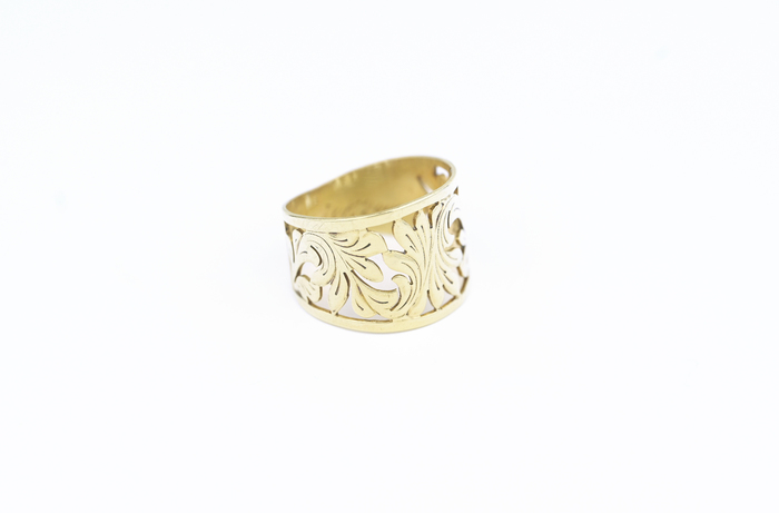 Zlatý prsten, prořezávaný motiv s listy.