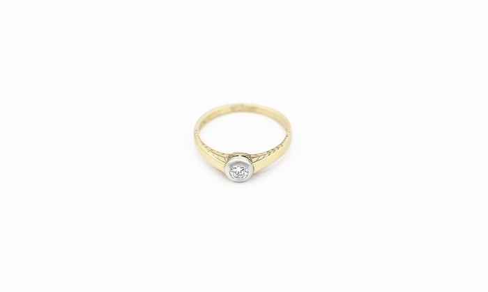 Diamant je usazený v kulaté korunce z bílého zlata, která pěkně kontrastuje se žlutou obroučkou. Boky obroučky jsou zdobeny jemným rytým vzorem.