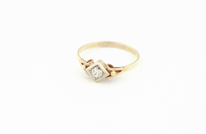 Zlatý prsten v kombinaci žlutého a červeného zlata s bezbarvým kamenem v čtvercovém zasazení.