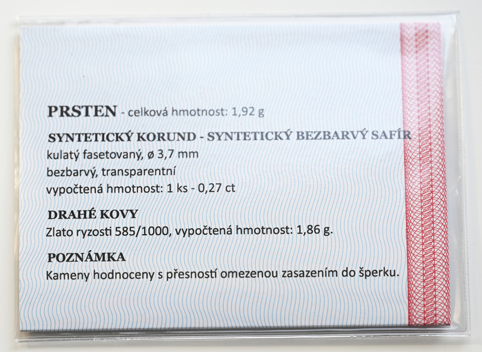 Kámen sedí v malém čtvercovém bílém zlatém rámu, který je po stranách doplněn drobnými výřezy z červeného zlata.