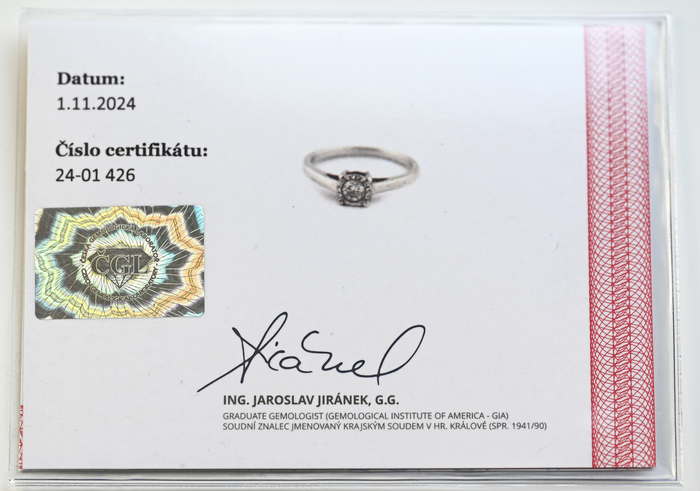 Prsten z bílého zlata s jedním čirým diamantem v korunce s drobnými výřezy.