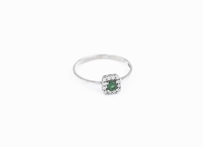 Zelený smaragd je obklopen řadou drobných čirých zirkonů uspořádaných do čtverce. Tenká hladká obroučka z bílého zlata drží celý šperk lehký a nenápadný.