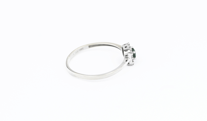 Zlatý prsten, z bílého zlata zdoberný smaragdem a zirkony.