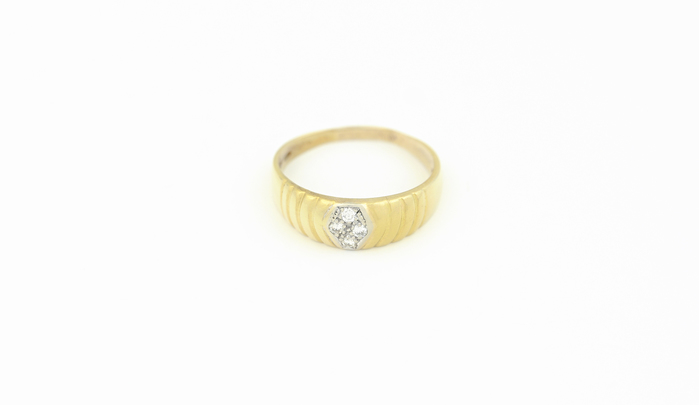 Žluté zlatý prsten s reliéfním povrchem a čtyřmi zasazenými diamanty uprostřed.