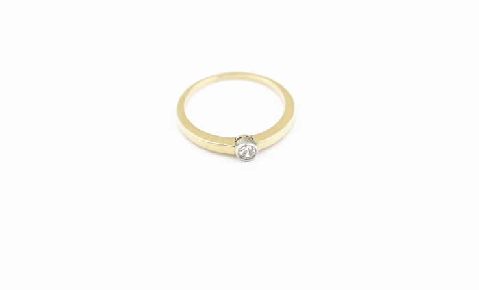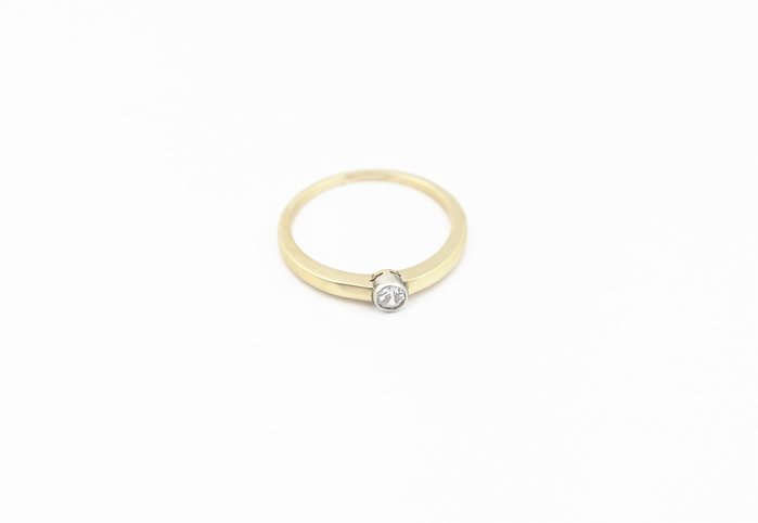 Hladká žlutá obroučka nese uprostřed jeden diamant obklopený kulatým bílým zlatem. Kámen je pevně uzavřen v pouzdře ze všech stran.