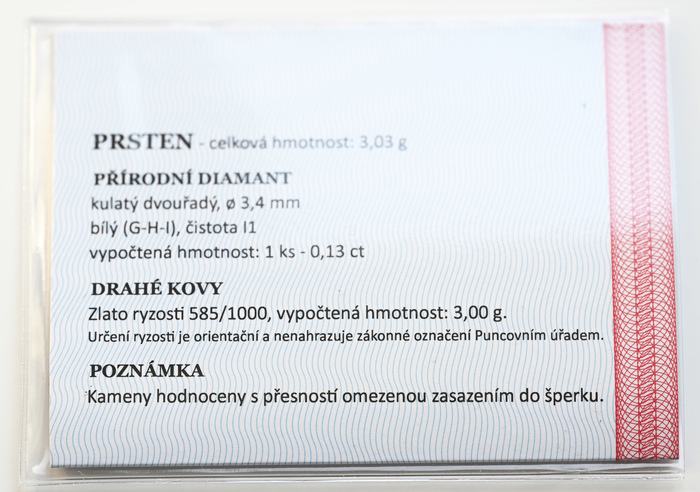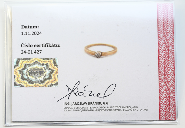 Zlatý prsten zdobený diamantem 0,13ct s korunkou z bílého zlata+certifikát.